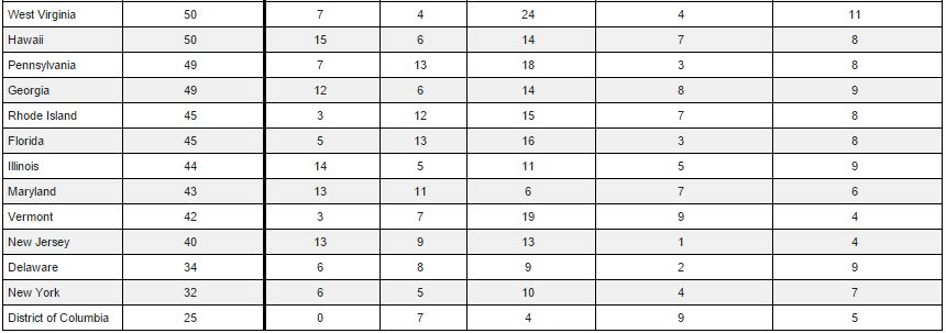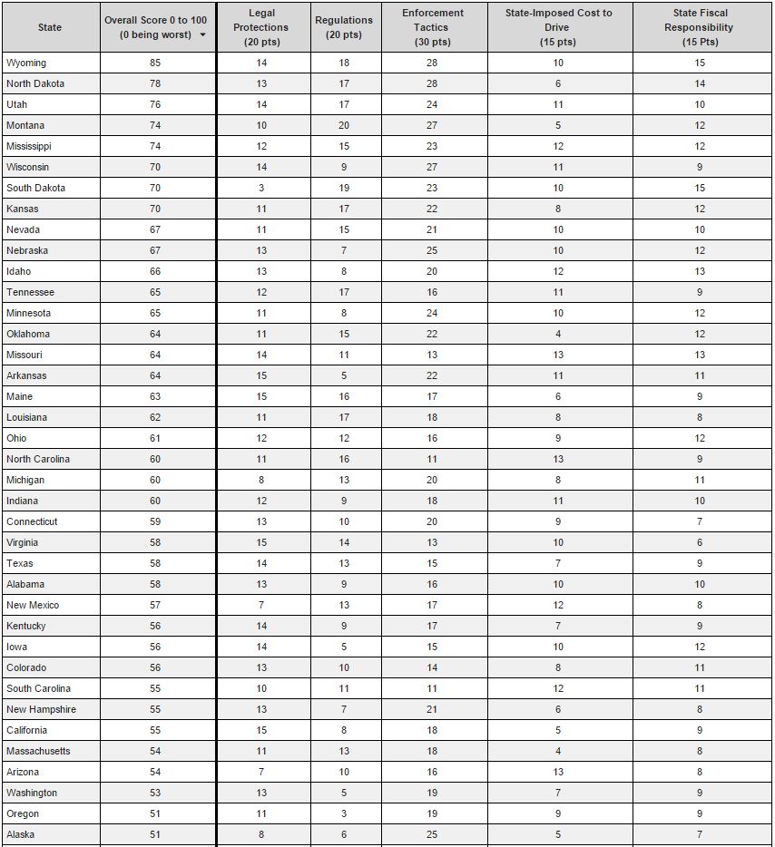 Because states view drivers’ rights with varying degrees of indifference, we decided to quantify what distinguishes each of the states in their treatment of motorists. Click here for a brief description of the five evaluation categories and the metrics that were considered in the NMA rankings. Numeric-based metrics were normalized by state-specific factors such as annual vehicle miles traveled (as published by NHTSA), total lane miles, and population density so that the states could be compared on a common scale.