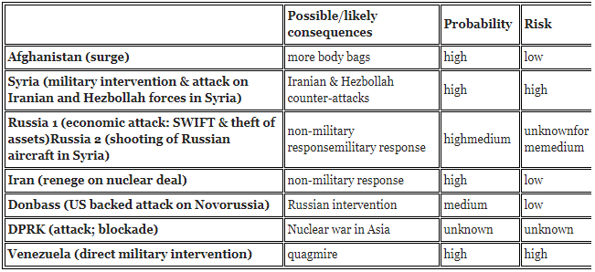 Frankly, I am not very confident about this attempt as analyzing the possible developments in 2018. All my education has always been based on a crucial central assumption: the other guy is rational. That is a huge assumption to make, but one which was fundamentally true during the Cold War. Today I find myself inclined to think that psychologists are probably better suited to make predictions about the actions of the rulers of the AngloZionist Empire than military analysts. Furthermore, history shows us that the combination of delusional imbeciles and dishonorable cowards is what typically brings down empires, we saw a very good example of that with the collapse of the Soviet Empire.