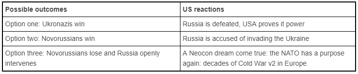 Donbass: will the Ukronazis finally attack? Well, they have been for many months already! Not only did they never stop shelling the Donbass, but they have this new “frog-jump” (pseudo) strategy which consists of moving in military forces in the neutral zone, seize an undefended town and then declare a major victory against Russia. They have also been re-arming, re-organizing, re-grouping and otherwise bolstering their forces in the East. As a result, the Urkonazis have at least 3:1 advantage against the Novorussians. However, we should not look at this from the Ukronazi or Novorussian point of view. Instead we should look at it from the Neocon point of view: