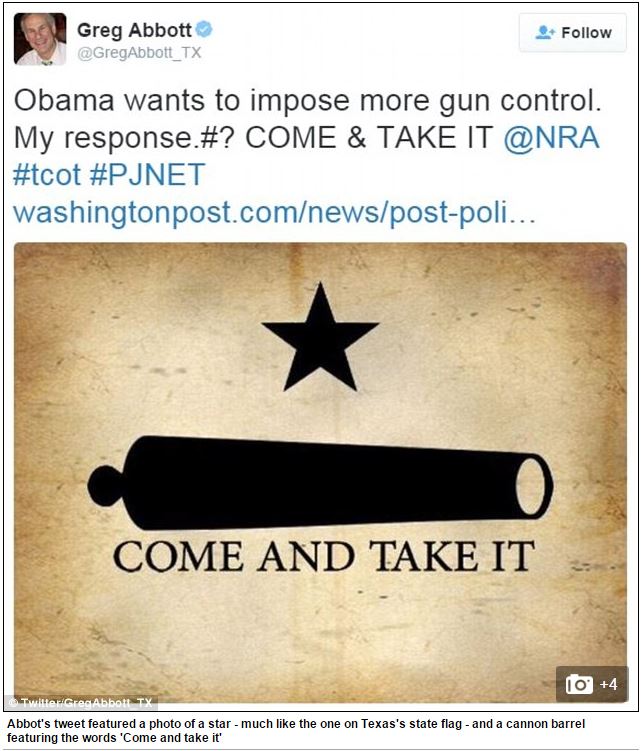 Meanwhile Governor Abbot tweeted: ‘Obama wants to impose more gun control. My response? COME & TAKE IT,’ he said in his tweet, while mentioning the NRA.