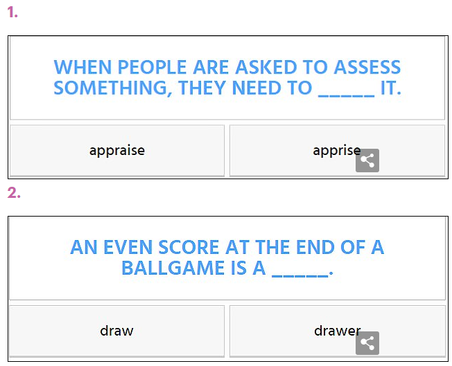 The test, designed for high school students, presents the player with 19 sentences – each with a missing word – and tasks the player with choosing the correctly spelled word to insert from two options provided.